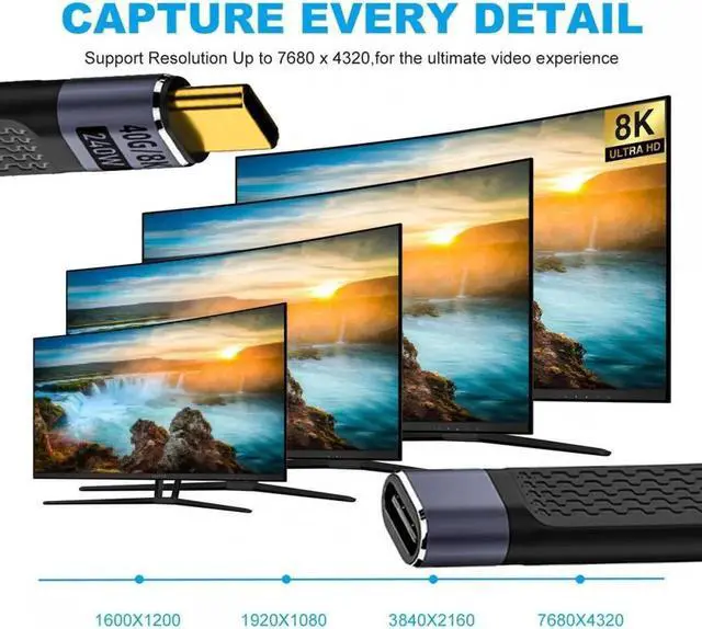 1) 8K/5K Ultra HD Video Output: This USB4 Cable enables to extend from your USB4 or thunderbolt3/4 Port equipped Devices to your USB-C Monitors, It supports Single 8K@60hz, 5K@60Hz or 4K@60Hz max. video Resolution in your external displays. (please make sure your monitor's Type-c port support DP Alternate Mode for Video. )