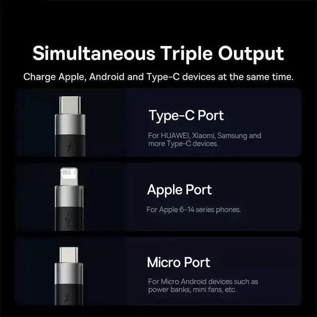 One cable with Micro USB and Type-C connectors, allowing you to charge multiple devices with different port typesperfect for families or travelers.