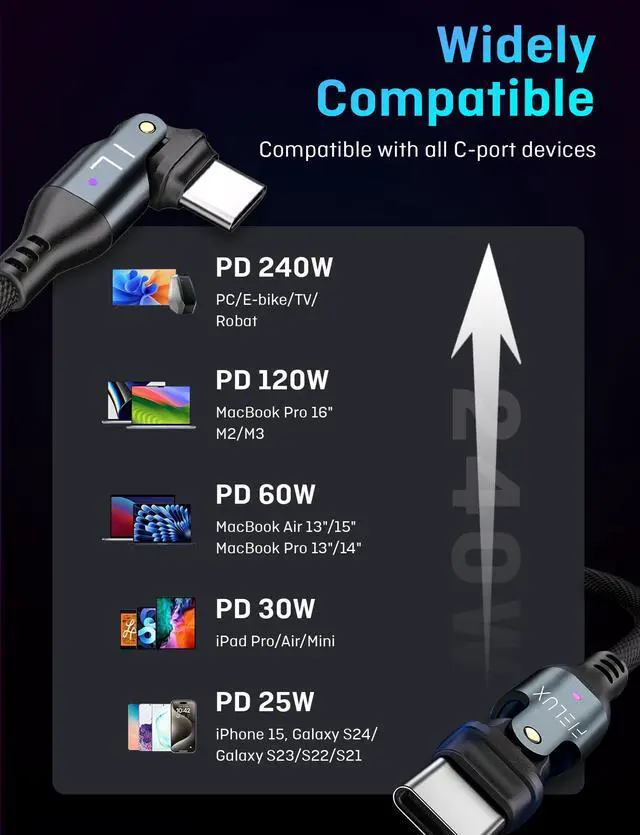 Powerful 240W Fast Charging: With support for Power Delivery (PD) 3.0 / 4.0 and Quick Charge (QC) 3.0 / 4.0 / 5.0 standards, this cable can handle up to 240W of power.