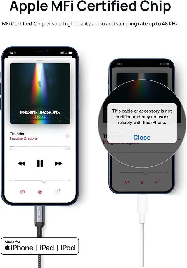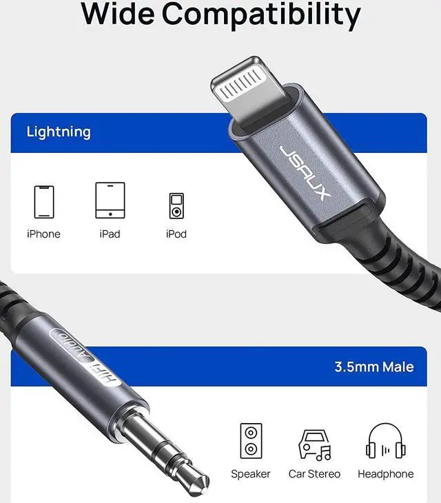 Trusted Apple MFi Certified: JSAUX Lightning to 3.5 mm Auxiliary Cable built with original terminal and original chip promises no warning message pops up, ensure completely and securely connect with your Apple devices.