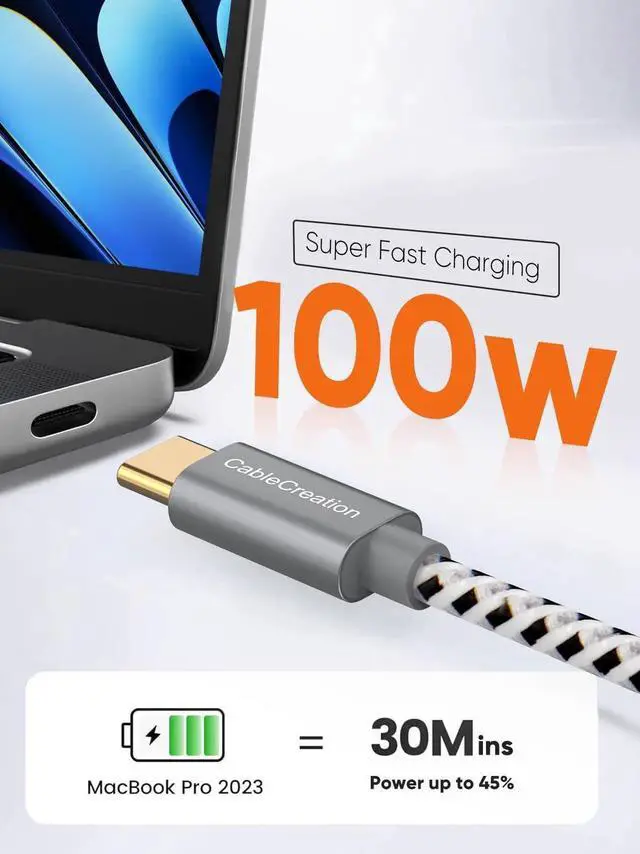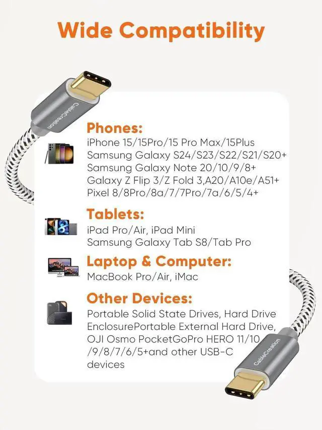 USB C to USB C 3.1 Gen 2 Cable Max Output: 20V/5A ,100W Data Transfer: 10Gbps Important Notes: This is USB C to USB C 3.1 Gen 2 Cable, fully compatible with USB C 3.1 Gen 2 Port and Thunderbolt 3 Port. The video function only works for USB-C devices whose USB-C port supports DP Alt Mode. Up to 100W 20V@5A Pass through supporting Power Delivery, comparable to the full speed original cord (Actual charging speed depends on your device and wall charger, with 96W original charger at a full 96W, with 45W original charger at a full 45W) Compatible with Type-C Port Smartphones: iPhone 16/ iPhone16 Plus/ iPhone 16 Pro Max/ iPhone 15Pro/15ProMax/15/15Plus Galaxy S24 / S24 Ultra / S24+/ S23 / S23+ / 23 Ultra / S22+ / S22 Ultra / S22 / S21 / S21+ / S20 / S10+ / S10e / S10 / S9 / S9+ ,Galaxy Note 20/20 ultra/Note 10/10+/10 Plus/Note 9/Note8/7 Galaxy Z Fold5/4/3/2+, Galaxy z flip 5/4/3 Galaxy A55/A54/A53/A52/A51+ Galaxy Tab A9/Tab A9+/Tab A 8.4 (2020)/Tab A7 Lite/Tab A7 10.4 (2022)+ Pixel 9/8/7/6/5/4a / 4a XL / 3a / 3a XL / 3 / 3XL / 2 / 2XL P30 / P30 Pro / P20 / P20 Pro Compatible with Type-C laptops/Tablets: MacBook Pro 16-inch (M1/M2/M3, 2019/2021/2023), MacBook Pro 15.4" (2019 / 2018 / 2017 / 2016), MacBook Pro 14 (2021), MacBook Pro 13.3" (2020 / 2019 / 2018 / 2017 / 2016), MacBook Pro (M1, 2020), MacBook (Retina, 12-inch, 2017) MacBook Air (M2, 2022), MacBook Air (15-inch, M2/M3, 2023/2024), MacBook Air (Retina, 13-inch, M2/M3, 2018/2020), MacBook Air (2020 / 2019 / 2018) iPad Air (5th generation), iPad Air (4th generation) iPad Pro 13-in.(M4, 2024), iPad Pro 13-in.(M2) iPad Pro 12.9" (5th generation), iPad Pro 12.9" (4th generation), iPad Pro 12.9" (3rd generation), iPad Pro 12.9 (2nd generation) iPad Pro 11-inch (4th generation) ,iPad Pro 11-inch (3rd generation), iPad Pro 11-inch (2nd generation), iPad Pro 11-inch (1st generation), iPad Pro 11-in.(M4, M2) iPad (2022,10th generation,10.9-inch), iPad mini (6th generation) AirPods Pro (2nd generation) XPS 15 / 13 Pixelbook L390 Yoga Galaxy Tab S3 Galaxy Book
