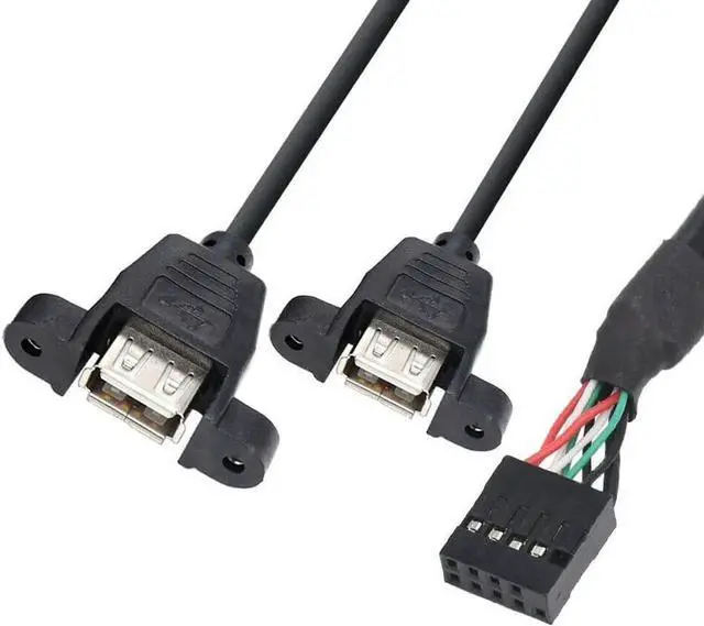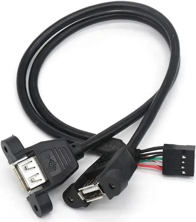 This panel mount cable fits a 2-port USB 2.0 (type A female) to a custom panel. Connects to a USB header on the motherboard. Compliant with USB 2.0 standard and backward compliant with USB 1.1 standard. Dual USB 2.0 female with screw panel mount. The distance between the 2 screws hole in the panel is 29mm. 9 pin female USB header connector with 0.1" / 2.54 mm pitch. Portable design and easy to install. Supports plug & play.