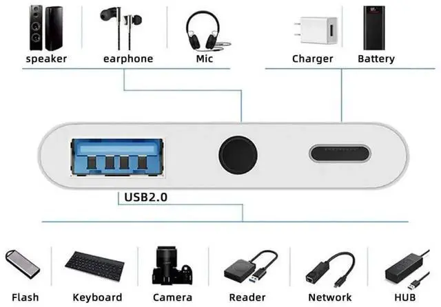 Type-C Input from Host and Audio 3.5mm/USB2.0 output to device.