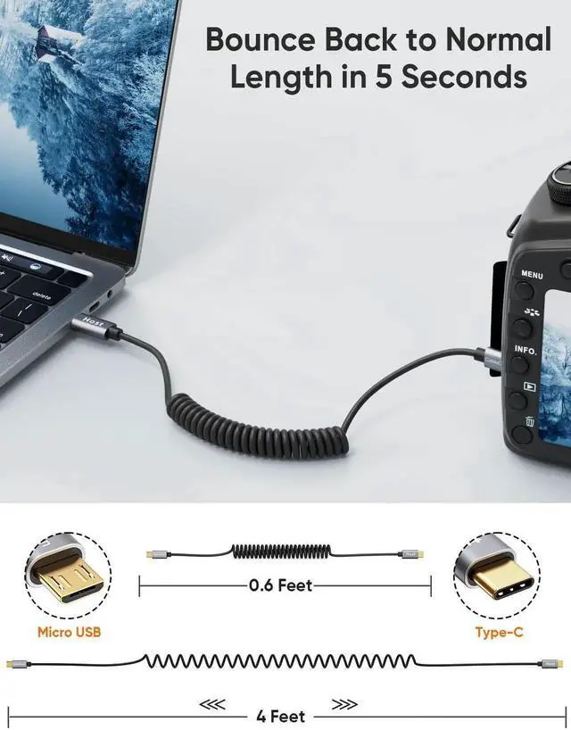 • Elastic Coiled Design: Coiled usb c cable to micro usb provides the perfect length for connecting two devices without having a tangled cable mess. Normal length is 0.6ft and can be stretched up to 4ft (limit length is 5ft). It will bounce back and auto-shrink to normal length in 5 seconds
