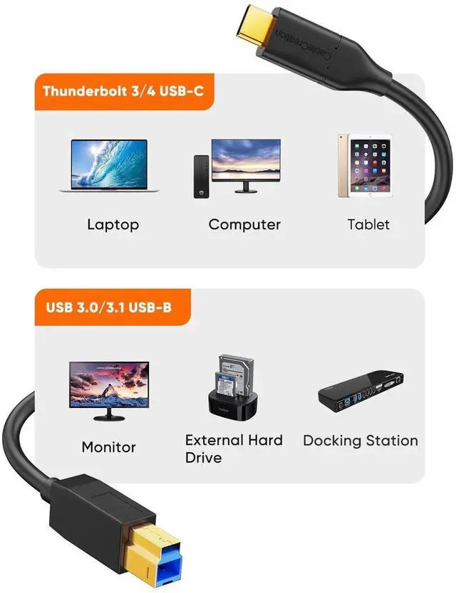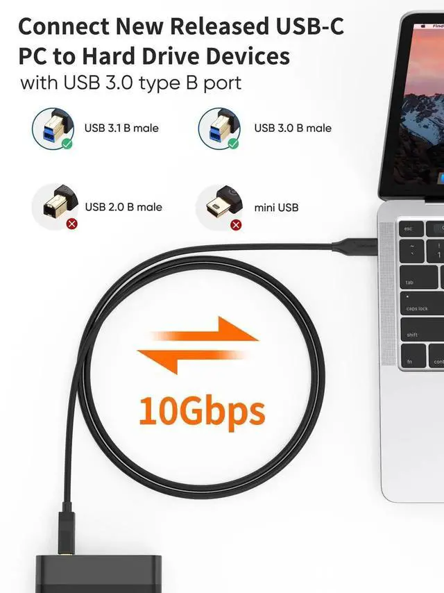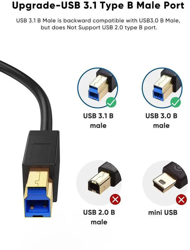 USB3.1 GEN2 USB-C to Standard USB B Male Printer Scanner Cable Side A: GEN2 Gold Plated USB Type C Male Plug (Gold Plated Plug to Guaranty the Contact With Device efficiently, Reduce the Signal Loss.) Side B: GEN 2 Gold Plated Standard USB 3.0 B Male Plug Test Proved 10 Gbt/s , See our Testing picture for reference Cable :1Pair+2C+2Pair Twisted Shielded Enhanced Signal Cable 100% Double Shielded Coverage Cable Color: Black Cable Length is 1.2Meters Approximately 4feet Q&A.: Question: This Cable looks similar to Normal USB B Male to USB-C Cable, Why GEN2 Cable data transfer rate reach 10G bt/s but normal USB B Male to USB-C cable data transfer only 480M bt/s ? Answers: This is GEN2 USB Type C to USB B Male Cable, please refer to the differences between them: For Normal USB CABLE: Inner wire is 1x twisted Pair (28AWG for Signal)+2C for Power For this GEN2 USB 3.1 CABLE: Inner wire is 1x Twisted Pair (28AWG for Signal)+2C for Power+2X Enhanced Shielded Twisted Pair for Signal. So the Data Transfer rate reach even over 10Gbt/s