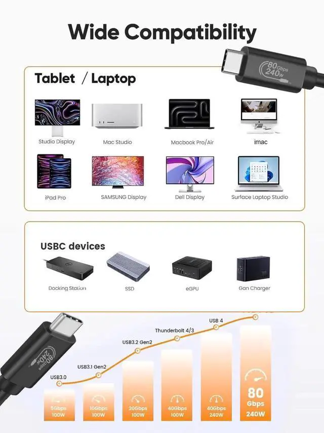 - Wide Compatibility: This usb c thunderbolt 5 cable fully compatible with Thunderbolt 5,Thunderbolt 4, Thunderbolt 3, USB4, and USB C devices. Compatible with MacBook M4 Pro/Max, Razer Blade, ACASIS SSD, iPhone 16, iPad, USB C monitors, docking stations, GaN chargers, eGPUs, etc