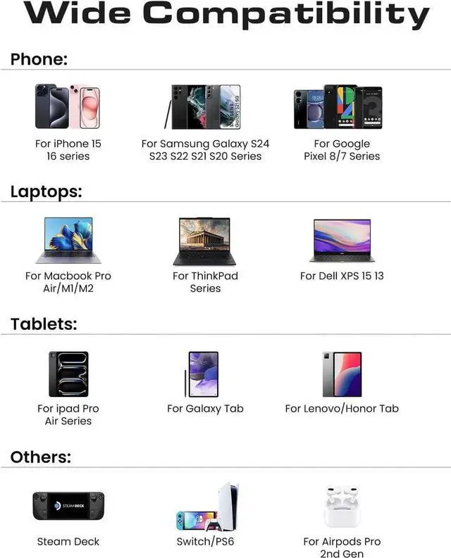 Compatibility: Designed specifically for compatibility with USB-C devices compatible with iPhone 16 15 series MacBook /iPad /Chromebook Galaxy S25/S24/S23 Pixel 9 8 7 Switch etc.
