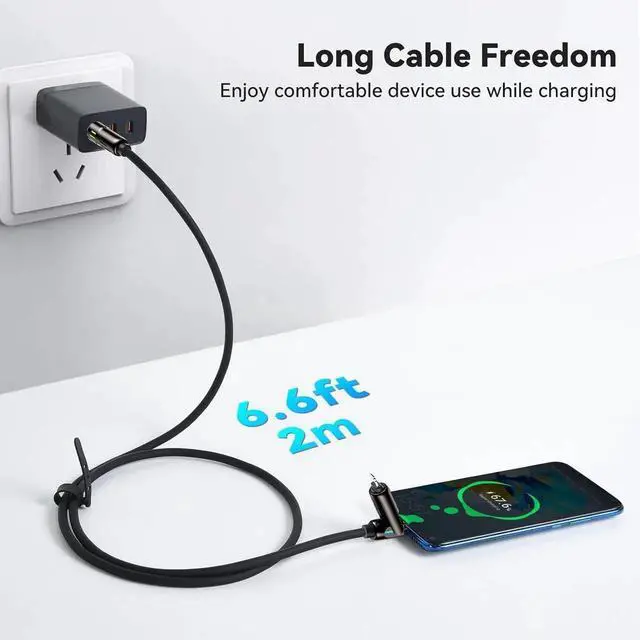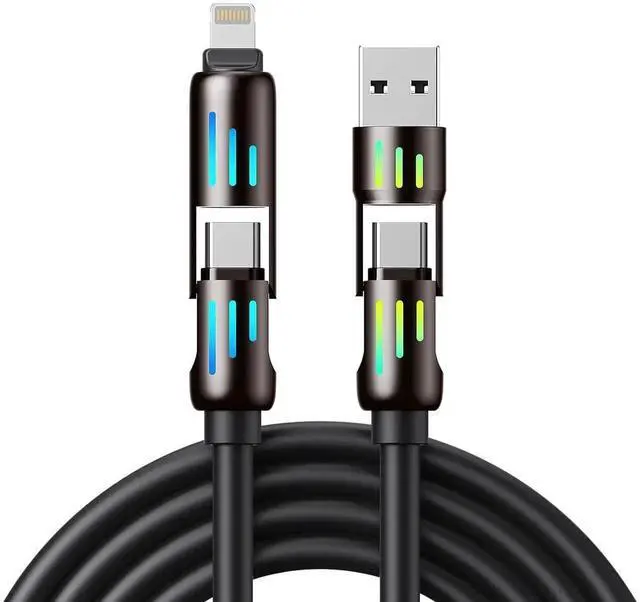 Eyecatching Charging LightsThe attractive colourful lighting creates a vibrant atmosphere making charging more enjoyable and stylish. You can easily find the wire in the dark avoiding the danger of the phone falling and the risk of being tripped by the wire when grabbing. Durable and ReliableMade of robust material this multi iPhone charger cord has a longer service life than other cables. Soft silicone wire prevents tangles and resists common wear and tear. The thickened core provides stable current output for your device ensuring a fast charging experience. Universal CompatibilityWith its 4-in-1 design this 4 in 1 USB C charging cable combines USB A USB C and lightning connectors making it compatible with a wide range of devices including smartphones tablets and laptops.