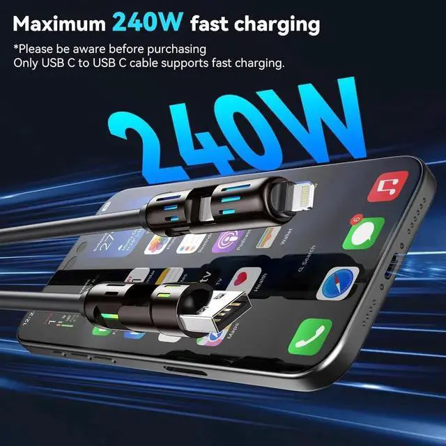 4 in 1 Multi Charging CableSimplify your charging setup with our versatile 4 in 1 USB C cable. It combines 4 ports - USB-C to Lightning USB-C to USB-C USB A to USB-C and USB-A to Lightning in one cable. Charge and sync your devices without the hassle of switching between multiple cables. 240W Fast Charging & Data Syncaceyoon multi fast charging cable ensures fast charging and provides reliable data synchronization for your devices. It provides up to 240W charging speed and up to 480Mbps data sync. * Please note the 240W fast charging is exclusive to USB-C to USB-C connections.