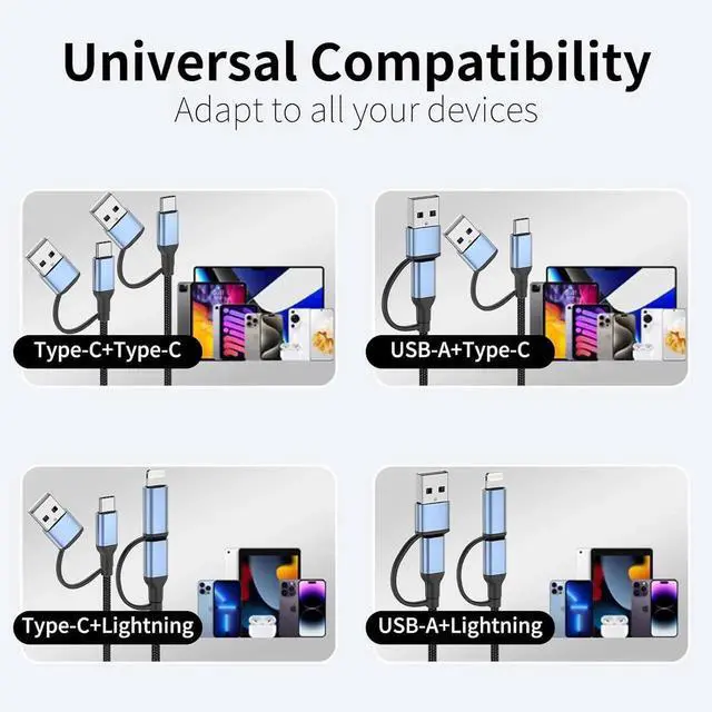 Cable Design: It combines four modes-USB A to C USB A to Lightning USB C to Lightning and USB C to USB C in one cable. 4-in-1 usb charging cable made of high-quality aluminum alloy and durable nylon braiding effectively extend its service lifeDurability and