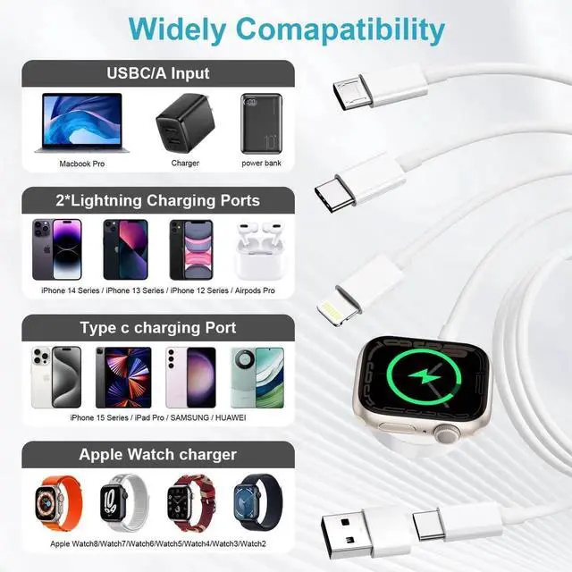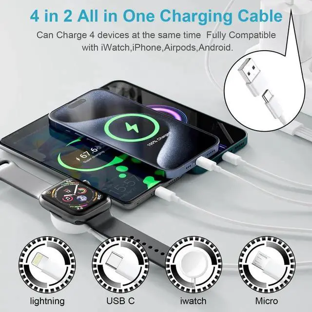 Charger Perfect Compatibility: This watch charger USB C is compatible with Watch Series 9/ 8/ 7/ 6/ 5/ 4/ 3/ 2/ SE/ Ultra. iPhone 15/15 Pro/15 Max/15 Pro Max/iPhone14/13/ 12/11 /Pro/Max/XR/XS/XS Max/X/8/8Plus/7/7 Plus/iPad/AirPods Type-C for Galaxy LG Google Pixel Nexus Lumia One Plus. Micro USB for most Android phones Pods TWS headphones and more. The 4 in 1 multi charging cable compatible with all iPhone and Watch series. Fast Charging iPhone Watch