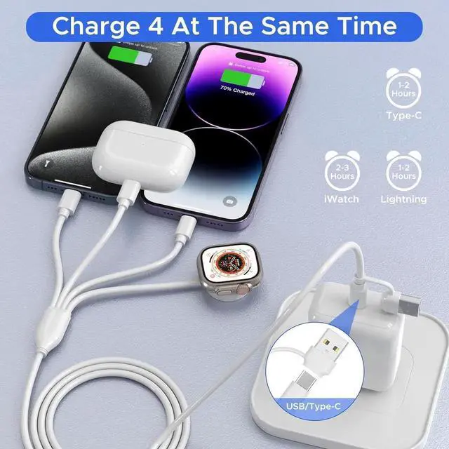 ?? Carbonfree CertifiedEach Amasuki product goes through a cradle-to-grave assessment to determine the products carbon footprint. The carbon emissions associated with the product are reduced where possible and remaining carbon emissions are offset with third-party verified carbon reduction projects in renewable energy energy efficiency and forestry?? Travel EssentialsThis multi charger cable with 4 output ports including 2xL/Type C/iWatch charger. USB A and USB C input connectors allow to charge anywhere. It means you will obtain the maximum use and space with the least cost?? Universal CompatibilityAmasuki Multi USB cable is compatible with iPhone 16/15/14/13/12/11/11 Pro/11 Pro Max/XS; iWatch series Ultra/10/9/8/7/6/SE2/SE/5/4/3/2/1; AirPods and iPads; Galaxy S23 S22 S21 S10 S9 S8 Note 9 8LG G5 G6 V20 Google Pixel Google Nexus 5X 6P other Type-C Android phones.