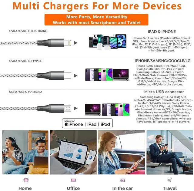 Versatile All-in-One Charging Powerhouse. Simplify your life with this MFI-certified multi charging cable designed to charge iPhones USB-C devices and Micro USB gadgets simultaneously. Its 3 in 1 charging cable design combines iPhone charger fast charging USB C cable fast charging and micro charging cable capabilitiesperfect for homes offices or travel. The rugged nylon braided exterior and metal aluminum shells resist fraying tangling and daily wear ensuring long-term durabilityLightning-Fast Charging for All Devices. Maximize efficiency with USB C fast charging cable technology that revives your iPhone charger USB C or Android device to 50% in minutes.
