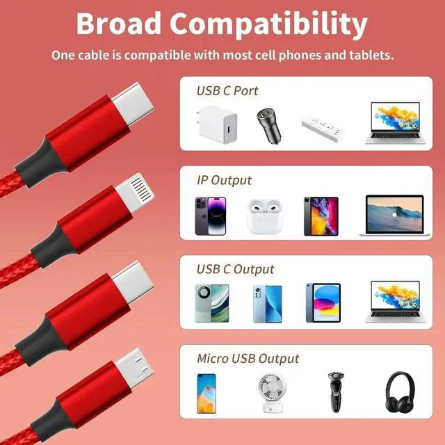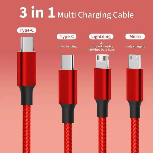 Length: 2Pack 4ft USB C multi charging cable enables you to charge your phone at ease. It's perfect for you to charge your phone when lying on the sofa or bed or sitting in the backseat of the car and so on! Bring one multiple charger cord which meets all your demands3 in 1
