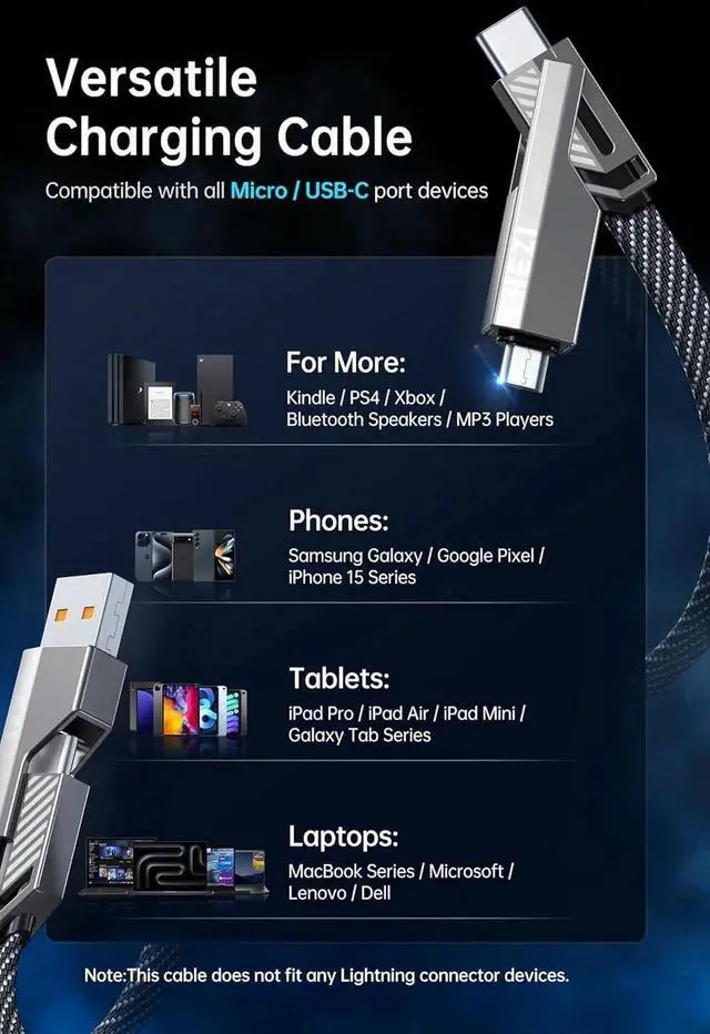 Charging Cable: This cable combines Micro Type C and USB A three kinds of ports. 1 cable is equivalent to 4 cables allowing you to easily achieve USB A to Micro USB A to Type C Type C to Micro Type C to Type C port conversion compatible with iPhone tablet MacBook Android phone and other devices. Welcome to the minimalist life and say bye to complicated piles of data cables60W Fast Charging & 480mbp/s