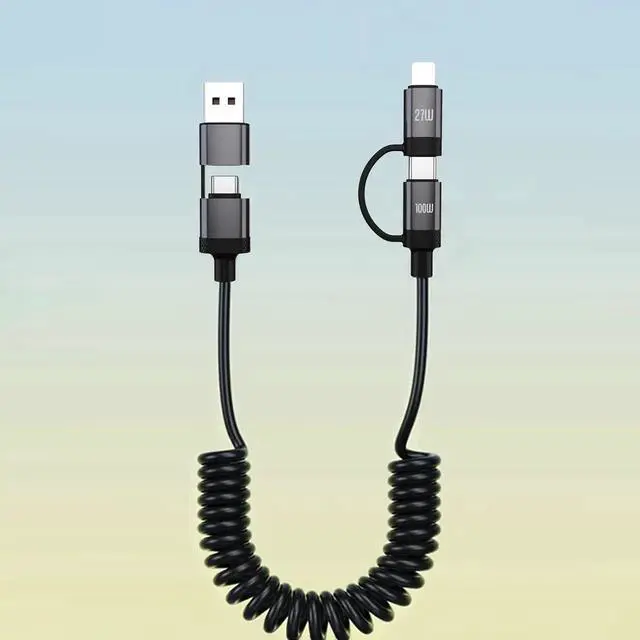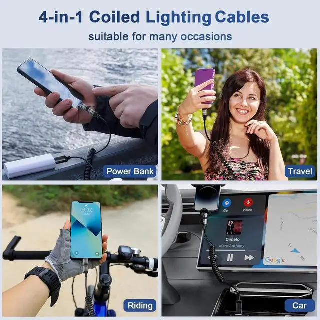 Versatile 4-in-1 DesignUSB C and lightning cable 2 in 1 features four connectors USB A to C USB A to Lighting USB C to Lighting and USB C to USB C. Compatible with all chargers making it perfect for charging multiple devices compatible with all iPhone models as well as Android smartphones tablets and other USB C powered devices. Retractable car charging cable with spring shape design portable and not tangledDurable and Flexible MFI Certified iPhone Charger MFi certified lighting cable usb c meet all standards ensures a reliable and solid connection charging and data transfer connect to CarPlay effortlessly.