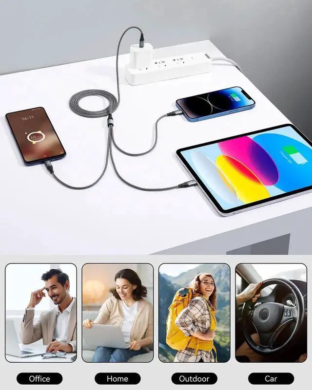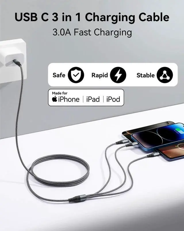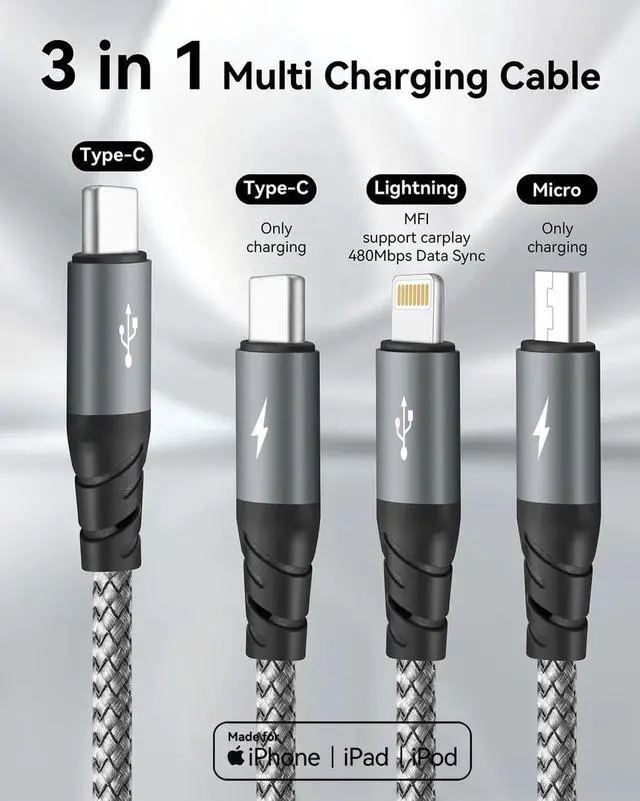 (NOTE: only the Lightning port support data transfer and Carplay function. Micro-USB and USB-C port just for charging. )?? Durability and SafetyOur 3 in 1 charging cable adopted internal *Thickened Copper Wire* makes charging more stable and is more friendly for the battery life of your devices. the outside flexible *Nylon Braided Sheath* and sturdy *Aluminum Alloy Connectors* provide enough durability for abrasion. 18 000+ bending lifespan of the multiple charger cord can meet long-term daily use.?? Universal CompatibilityThis chargers for multiple devices can charge almost all your devices. the usb c multi charging cable compatible with iPhone 16 15 14 13 12 11 Pro Max/16 15 14 13 12 11 Pro/15 14 13 12 mini/16 15 14 Plus/16 15 14 13 12 11/SE/Xs Max/Xs/Xr/X/8 Plus/8/7 Plus/7/6s Plus/6s/6 Plus/6/5/5s Pad Air/Pro Pod/replacement Nano7/Galaxy UItra/S24+/S24/S23+/S23/S22+/S22/S21+/S21/S20+/S20/S10+/S10/S9/S8/Note 7 8 9 10 20 HTC LG Google Pixel Moto PS 4/5 and other Android devices for most mobile phone charging. Please use USB-C power adapters.?? MFi Certified and PortableThis multi chargers for all devices is MFi certified ensuring compatibility with all lightning devices. 6Feet/ 1.8M long charging cords for multiple devices enable you to charge your devices at ease.