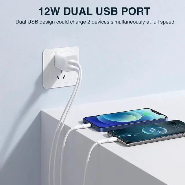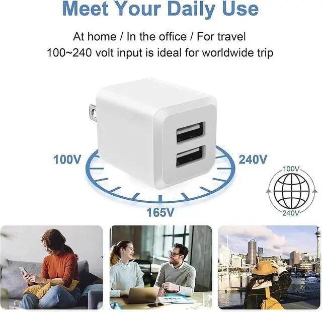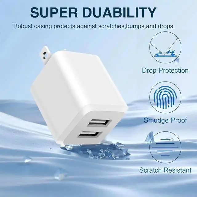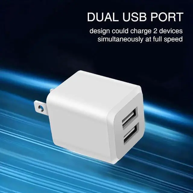 Premium PerformanceDual-USB Charger output cell phone charger with a total current of 5V/ 2.4A and input with 110-130VIt can simultaneously charge two mobile devices allowing you to save more timeSafe ChargingUSB Wall Charger is made of PC fireproof material and is equipped with multiple protections such as output short circuit protection and built-in over-current over-voltage and over-heating protection. The USB Charge adapter has undergone rigorous testing to ensure a longer service life and safer charging. And the phone charger block also features an automatic stop charging function when the battery is fullSpecifically DesignedCell phone charger features a heat-resistant and anti-throw design.
