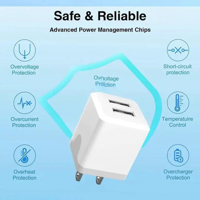 Premium Performance: Dual USB Charger output cell phone charger Simply plug in the USB cable and plug the adapter into the wall. Compact with a total current of 5V/ 2.4A and input with 110-130VIt can simultaneously charge two mobile devices allowing you to save more timeProtection function: USB Wall Charger is made of fireproof material and is equipped with multiple protections such as output short circuit protection and built-in over-current over-voltage and over-heating protection. The USB Charge adapter has undergone rigorous testing to ensure a longer service life and safer charging. And the phone charger block also features an automatic stop charging function when the battery is fullSpecifically