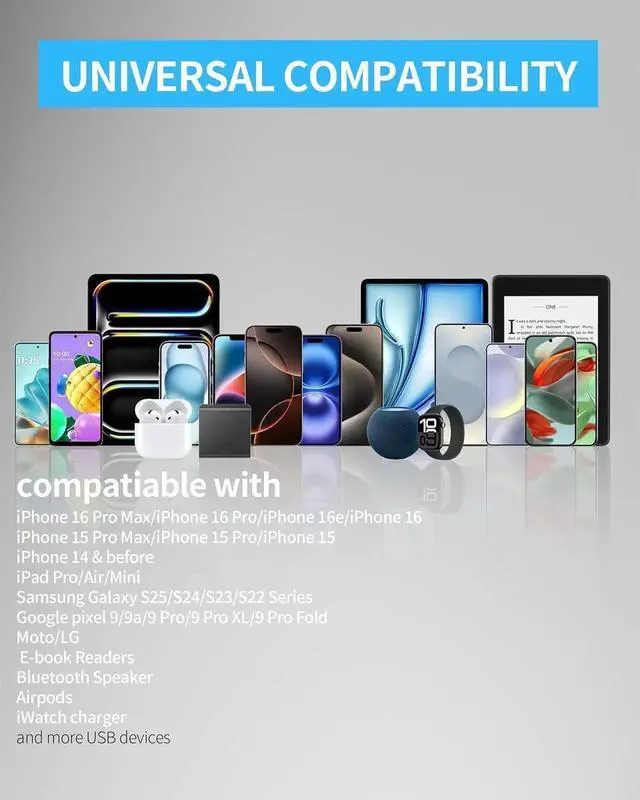 Widely Compatibility: USB charger block compatible with iPhone 16e 16 15 14 13 12 11 Pro Max XS XR X 8 7 6 6S Plus 5S 5 4S Pad Pod i Watch Series/Ultra Galaxy Note Moto Google Pixel LG Android Phones Small fan Small Speaker Electric Toothbrush Bluetooth Speaker E-book Readers Electric Shaver and more USB devicesSimultaneous