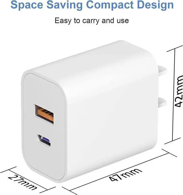 [High-Speed Charging & Dual Port Design] Fast Charger Block with 20W of output power USB-C and USB-A block frees you from messy chargers with various interfaces ports to charge two devices simultaneously at high speed. Charging your iPhone 16 up to 50% in just 30 minutes 75% faster than the ordinary 5W charger saving over 1.5 hrs for you. [Wide Compatibility] Fast charge your iPhone 16/16 Pro/16 Pro Max/16 Plus/ iPhone 15 / 15 Pro / 15 Pro Max / 15 Plus / 14 / 14 Plus / 14 Pro / 14 Pro Max / 13 / 13 Pro Max / 13 Mini / 12 / 12 Pro Max / 12 Mini / SE / 11 / XS / XS Max / XR / X / 8 Pad AirPods Galaxy S22 / S21 / S20 / S10 Note 20 / 10 Google Pixel 8/7/ 7Pro / 6 / 5 / 4a / 4XL / 4 or other devices that support USB and USB-C Power Delivery.