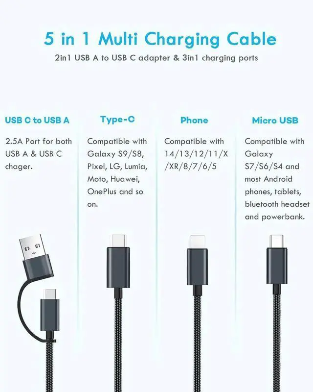 Charging Cable: Package includes 2 pcs 4ft multi charger cable 5 in 1. 2 in 1 USB A to USB C adapter and 3 in 1 charging ports micro USB/type-C/phone ports. It works with both USB A and USB C chargers and supports charging most mobile phones.