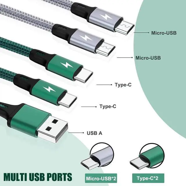 2 Micro USB +2 Type C PortThe 4 in 1 fast charging cable with 2* Micro USB and 2* Type C charging cables for multiple devices. It is equivalent to 2 Type-C fast charging cables and 2 Micro-USB charging cables. It makes your daily life much easier when you are in a car office and traveling don't worry about your electronic device without enough electricity3A High-Speed ChargeThe multi 4 in 1 fast charger cable uses high -quality 5 -core copper wires smart chips it charging speed up to 3A maximum which can charge your 4 devices at the same time the more the connection is charging the slower the charging speed (NOTE: not support data transfer)Universal Compatibility 1.2 m nylon braided multi chager cable for iPhone 15 Galaxy S24/ S23/ S22/ S21/ S20/ S10/ S9/ S8/ S7/ S6/ Note 9/ Note 8/ A5/ A3 P30/ P20/ P10/ Mate 20/ Mate 10 Honor View 10/ 9 LG G6 HTC Moto-rola N-exus S-ony Xperia Kindle Echo Dot PS4 and other devices with a Micro-USB/ Type- C portQuick Charge Your iPhone 15The two USB C connector of the multi charging cable is compatible with the latest iPhone 15 series mobile phones. Although it is not a super fast charging 60W cable its current is up to 3.0A which is 30% faster than the traditional USB C cableStrengthen DurabilityCable encased with Strong-Braided Nylon fiber which make it have excellent anti-twisting and abrasion-proof property. Can withstand at least 10 000 cycles of 90 degree bend testAdvanced Service Support2 Pack Multi usb charging cable 3A/ 1.2M. With 12-Month warranty and 24/7 customer service. If you have any questions pls contact us via Email we will help you solve the problem as soon as possible