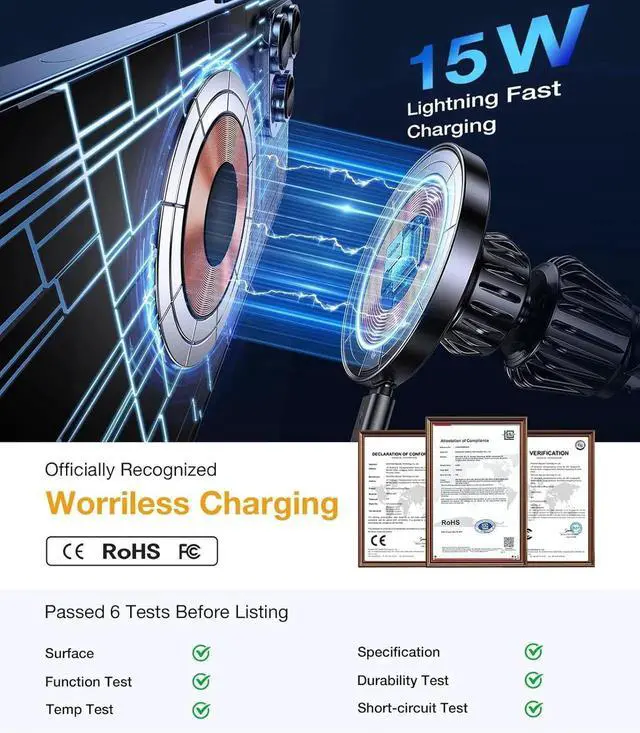 Note: Charging speed decreases after 85%? STRONG MAGNETIC MagSafe Car Mount- Equipped with 20 X N55 magnets our phone mount for car has far more magnetic power than any car phone holder on the market. Even during bumpy rides resembling a roller coaster your phone will never fall off and distract you. Annular closed magnetic field not interfere with the signal or battery drain.? 360° Flexile & One Hand Operation- 360°adjustable angle so you can easily get the best viewing angle. Ensures easy hands-free driving with less distraction make calls and GPS navigation safer. As the slogan goes everything just clicks and we all can enjoy the convenience of Magsafe.? Designed for Magsafe- This for Magsafe Car Charger is compatible with iPhone16/ 16e/ 16Pro/ 16 Plus/ 16 Pro Max /15/15 Pro/15 Plus/15 Pro Max/14/14 Pro/14 Plus/14 Pro Max/14 Mini/13/ 13 Pro/ 13 Pro Max/ 13 Mini/ 12/ 12 Pro/ 12 Pro Max/ 12 Mini MagSafe Case.????????????????????:?????????????????????????????????????????????????????????????????????????????????????????????????????? (?????????????????????? )