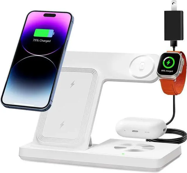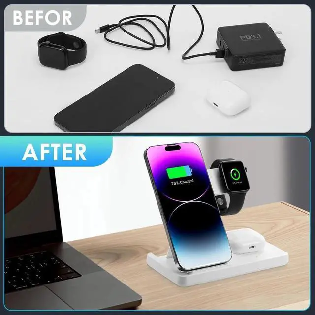 Upgrade!! 3 in 1 wireless charger station for: This is a convenient compact foldable 3 in 1 wireless charger station. The wireless charger station can charge your phone Watch and AirPods at the same time wireless charger station is ideal for AirPods 1/2/3//Pro2 (Only working for Light-ning interface interface type) for Watch Series 9/Ultra 2/Ultra/8/7/SE/6/5/4/3/2.