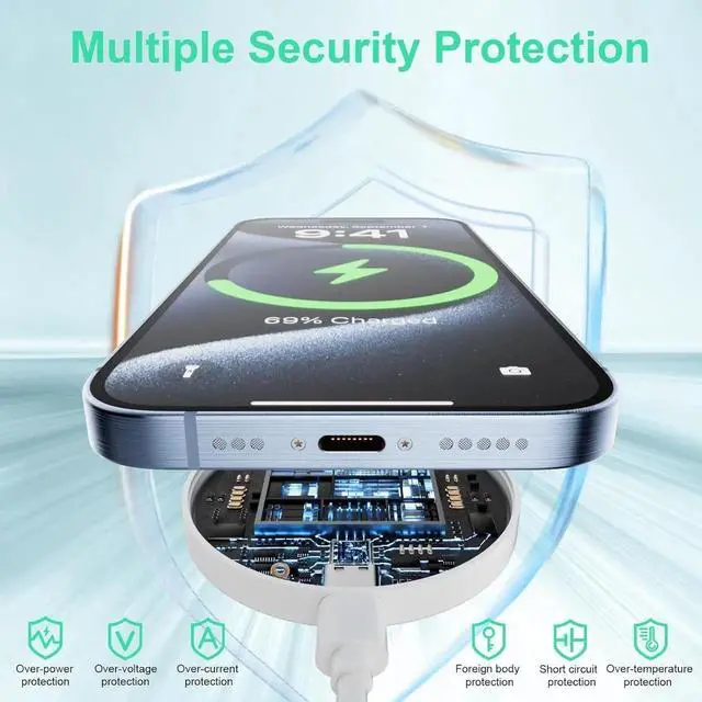 Foreign object detection: Rapid blue-green flashing for clear notification. Advanced Safety Protection + Efficient CoolingBuilt-in smart chip monitors for overcharging overcurrent overvoltage overheating and short circuits. In case of any abnormality the LED indicator will flash blue and green rapidly and automatically stop charging. Features honeycomb cooling vents on the back to dissipate heat effectively ensuring safe and stable charging. Wide CompatibilityWorks with