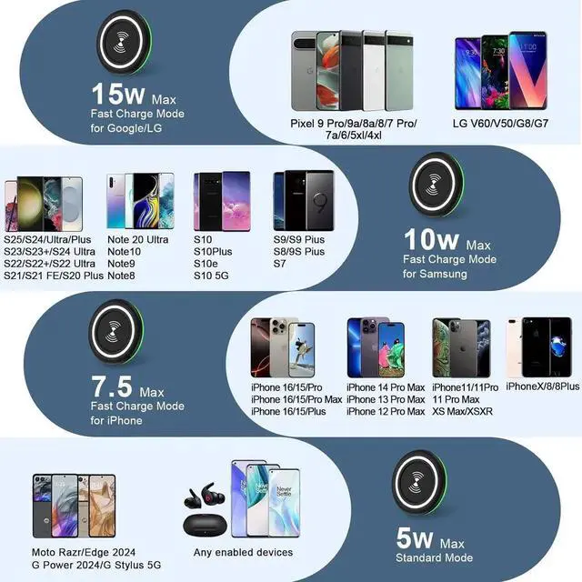Widely Charging Model: 15W Fast wireless charger pad for Google Pixel 9a/9 Pro xl/8a/8 Pro/7a/7 Pro/6 Pro/6/5/5XL/4/4XL/Fold LG 10W wireless charger fast charging pad for Galaxy S25 Ultra S24 FE S23 S22 Ultra/S22/S21 FE/S21/S20 S10 S9 S8 Plus Z Flip 6/5/4/3 Z Fold 6/5/4/3 Note 20 Ultra/10/9. 7.5W wireless charging station for iPhone 16e/16/16 Pro/16 Plus 16 Pro Max/15/15 Pro Max/15 Plus/14/14 Plus/14 Pro Max/13/13 mini/13 Pro Max/12/12 Pro/12 Pro Max/11/11 Pro Max/XS/XR/8 Plus. 5W for any enabled devices.
