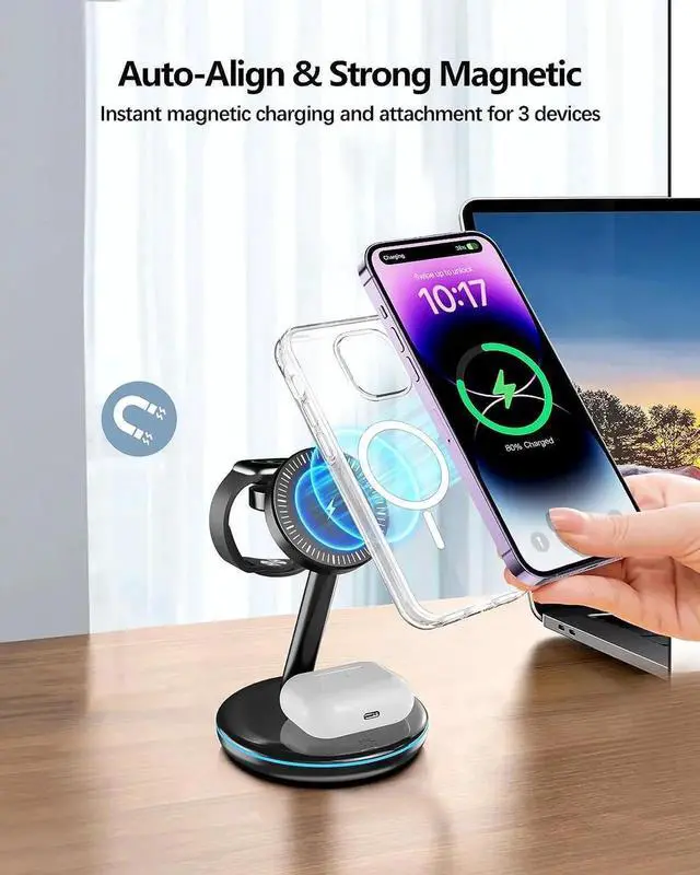 ?? 3 in 1 Wireless Mag-Safe Charging StandMagnetic Wireless Charger 3 in 1 makes fast charging safe and easy. The Mag Safe charging station adopts the most advanced magnet technology and instant and precise alignment in just 1s bringing you a fast and stable magnetic wireless charging experience. The iPhone Mag-Safe charger supports 360° rotation to hold your iPhone in any direction according to the scenario.?? Wireless Charging Station for DevicesOur 3 in 1 iPhone charging station provides 3 charging points say goodbye to cluttered desktops and charge your iPhone iWatch and AirPods at the same time.