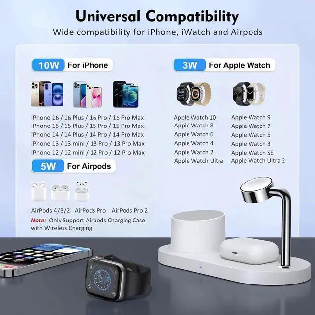 & Wide Compatible: Equipped with a 18W fast adapter it only takes 3-4 hours to fully charge your iPhone. We recommend using the 9V/2A adapter or the original adapter for a better charging experience. Our charger is widely compatible with iPhone 16e/16/16 Plus/16 Pro/16 Pro Max/iPhone 15/15 Plus/15 Pro/15 Pro Max/iPhone 14/14 Plus/14 Pro/14 Pro Max/13 mini/13/13 Pro/13 Pro Max/12 mini/12/12 Pro/12 Pro Max iWatch Series 10/9/8/7/6/5/4/3/2/SE/Ultra/Ultra2 AirPods 4/3/2/Pro/Pro 2 (Supports AirPods Charging Case with Wireless Charging Only Not Supports A1602 and A2897)