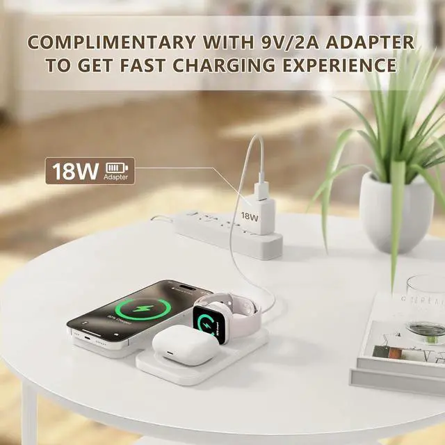 You Get: 3-in-1 Magnetic Wireless Charge Station x 1; User Manual x 1; 18W QC adapter x 1; Fast Charging Cable-USB Type C Power x 1 Please do not wear a case thicker than 5mm 0.2. The magnetic attraction function only supports i Phone 12 and above mobile phonesNote: The outer ring of the wireless charger is silver in colour with a blue protective film on the surface to prevent scratches during transport; please peel off the blue protective film from the surface before use