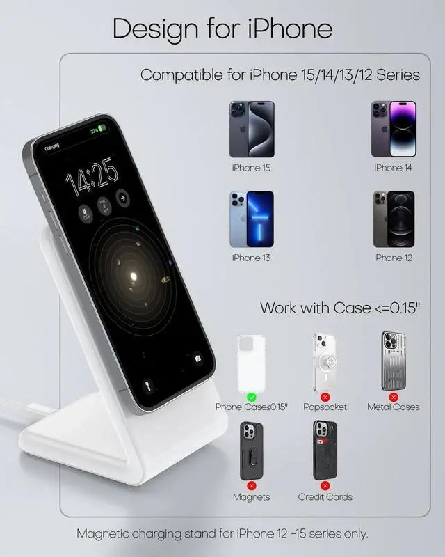 Quick and Easy Magnetic Charging - Super-strong magnets snap magnetically into place to ensure perfect alignment and secure hold for a stable and efficient charge every time. iPhone-Optimized Design - Exclusively crafted for MagSafe-enabled iPhones including all 12-16 series models (Pro Pro Max mini Plus). For optimal performance use caseless or with MagSafe-compatible cases only. Charge Smarter Not Harder From bedside tables to office desks redefine wireless charging with intelligent MagSafe integration and adaptive ergonomics. Certified Overnight Safety - FCC-approved protection system actively monitors and prevents overcharging/overheating risks. Sleep worry-free knowing your iPhone auto-regulates to 100% by dawn.