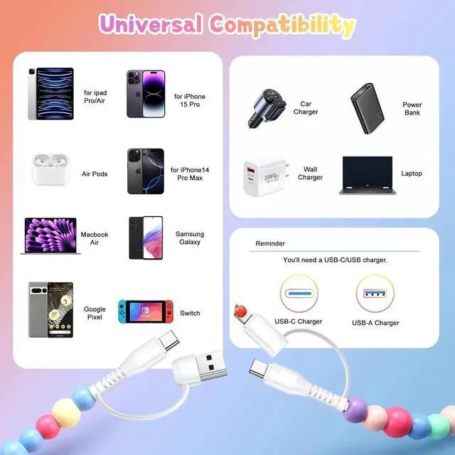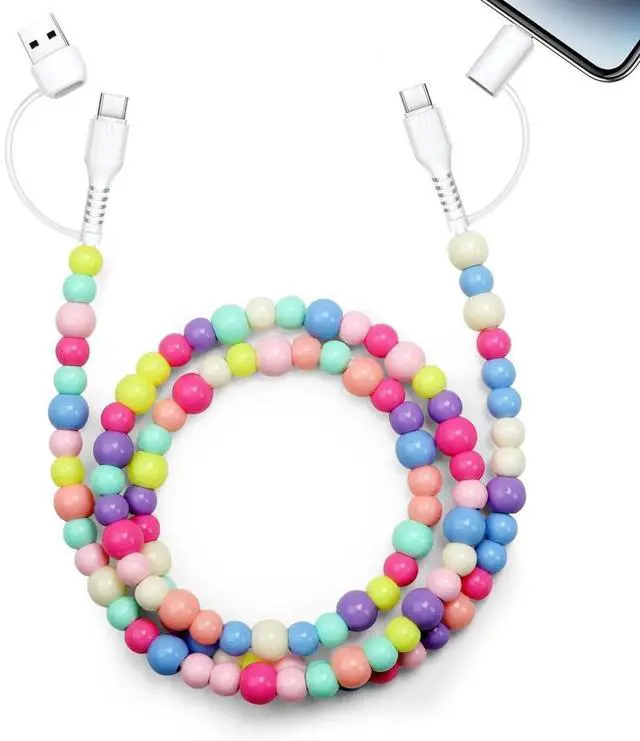 Fast Charging: The 4 in 1 Multi Charging Cable delivers 66W of safe charging power with fast and steady energy inflow; Featuring a colourful beaded design this usb c charger cable can charge most phones from 0% to 60% in 30 minutesRugged and