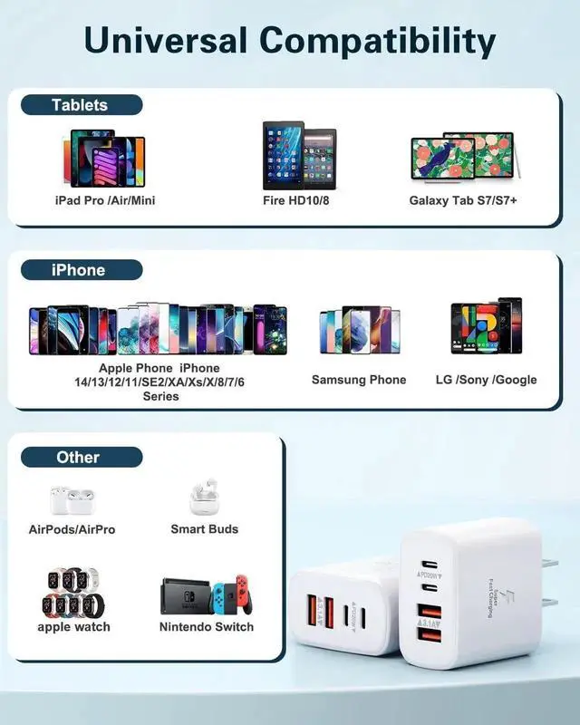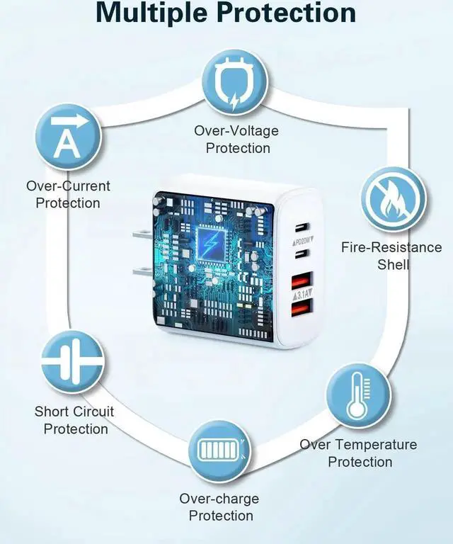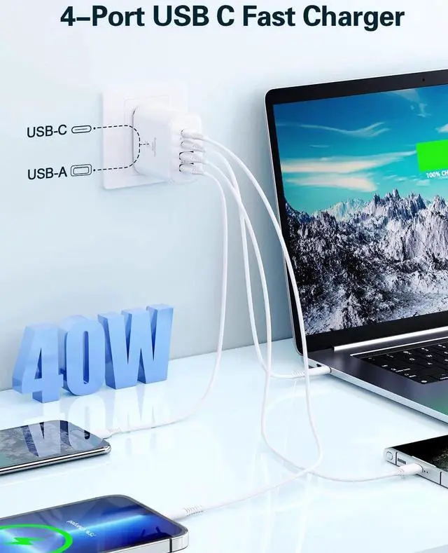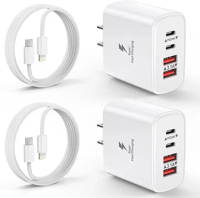 Charger Block: BECHAGE fast charger plug with 4-Ports (Two ports USB C +Two ports USB A) can fast charge 4 devices simultaneously at up to 40W. Choosing multiport 40W charger plug minimize waiting time and frees you from messy chargers with various interfaces.?? 2-Pach 6FT USB C to Lightning Cable- BECHAGE iphone charging cable adopts the latest MFI C94 lightning end which can fast charge for your iphone 14 13. It also supports data transfer speeds of up to 480Mbps. The USB C to Lightning cable is braided with nylon material for extra protection and durability?? Wide Compatibility- BECHAGE Charger Block with Dual USB-C port and Dual USB-A port Compatible with iPhone 14/14 Plus/14 Pro/14 Pro Max/13/13 Mini/13 Pro/13 Pro Max/12/12 Mini/12 Pro/12 Pro Max/11/ 11 Pro/11 Pro Max/XS Max/XS/XR /X/8/8 Plus/SE/ iPad Pro/ Air /Mini?? Multiple Safety Protection- BECHAGE USB C Charger Block has approved CE FCC & ETL certifications. Equips with Short Circuit Protection Over Temperature Protection Overcurrent Protection Overvoltage Protection Over Power Protection for worry-free charging.?? What You Will Get - 2-Pack 40W 4 Port fast charging block with 2 Pack 6ft USB C to Lightning Cable (White) with worry-free 18-month warranty and friendly customer service.