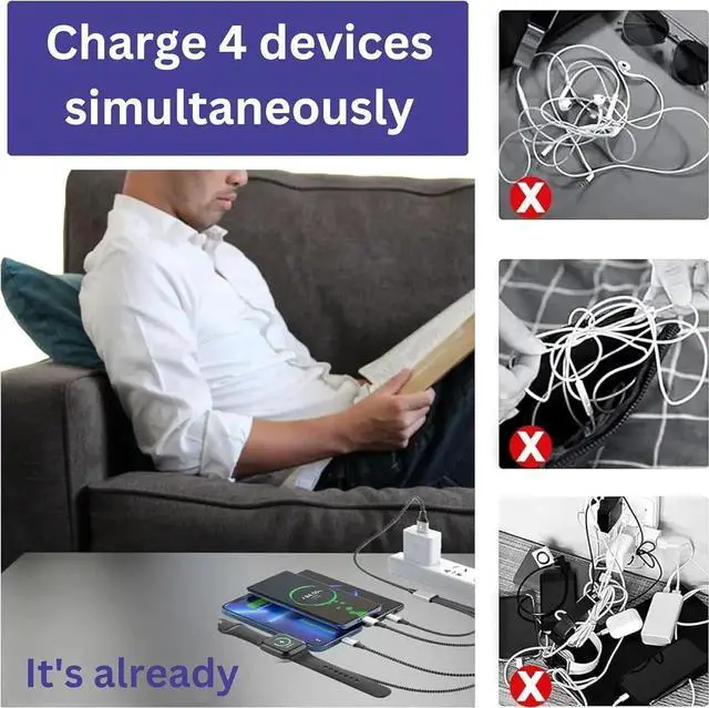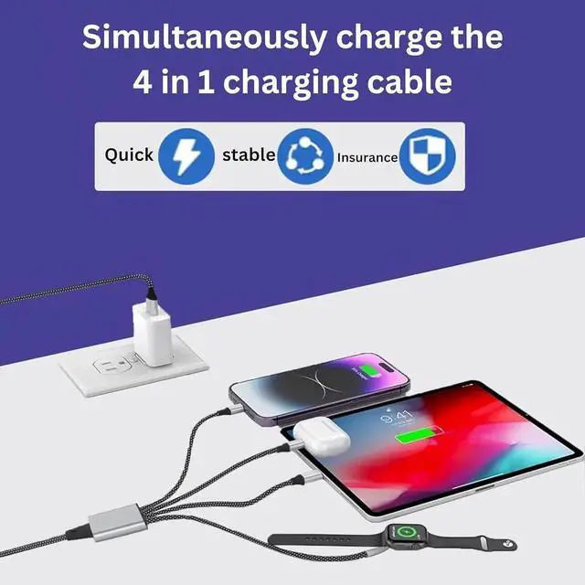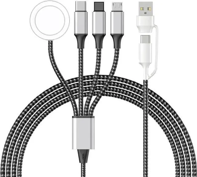 ?? Travel Essentials This multi-charger cable features 4 output ports including Light*ning/Type C/Micro USB/i-Watch chargers. With USB A and USB C input connectors it enables charging from anywhere. This design maximizes functionality and saves space all at an affordable cost.?? Magnetic iWatch Charger Featuring dual chips and integrated magnetic technology charging your i-Watch is effortless. Strong magnetic adsorption just hold the connector close to the back of the watch and it will automatically pull it into place to steadily charge your watch.?? High Quality Material The nylon braided design ensuring excellent durability and flexibility tests to withstand 40000 bends which offering a longer lifespan.