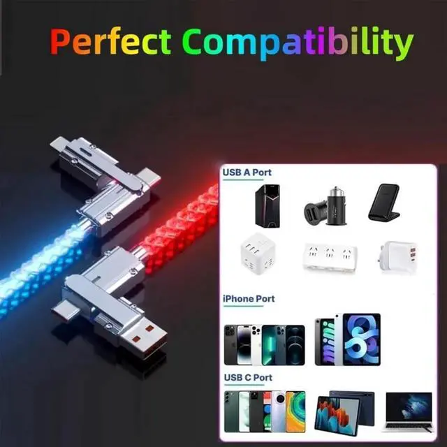 ? 4-in-1 RGB Flowing LED Light UpRGB LED glowing 4-in-1 Colorful LED Light Up Flowing charging cable is compatible with Most Cell Phones port devices. USB+lighting Type-C+Type-C USB+Type-C Type-C+lighting four models to switch freely flowing like stream when it is connected with adapters.? 66W Fast Charging Cable and Data Transfer 66W Light up charging cable adopts pure thick copper inside and smart chips which makes charging speed up 50% than usual charging cable. And it supports data transmission which can reach 480Mbps (Only the type c port supports data transmission).? Enhanced Durability 4 in 1 light up charging cable adopts aluminum alloy shell micro-arc oxidation process.
