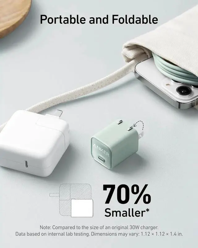 Small Yet Powerful: By swapping out silicon for Gallium Nitride (GaN) we've been able to fit 30W of power into a charger that's just 1.12 inches thick and 70% smaller than an original 30W charger.