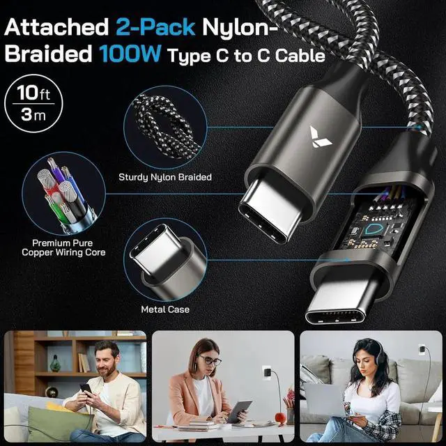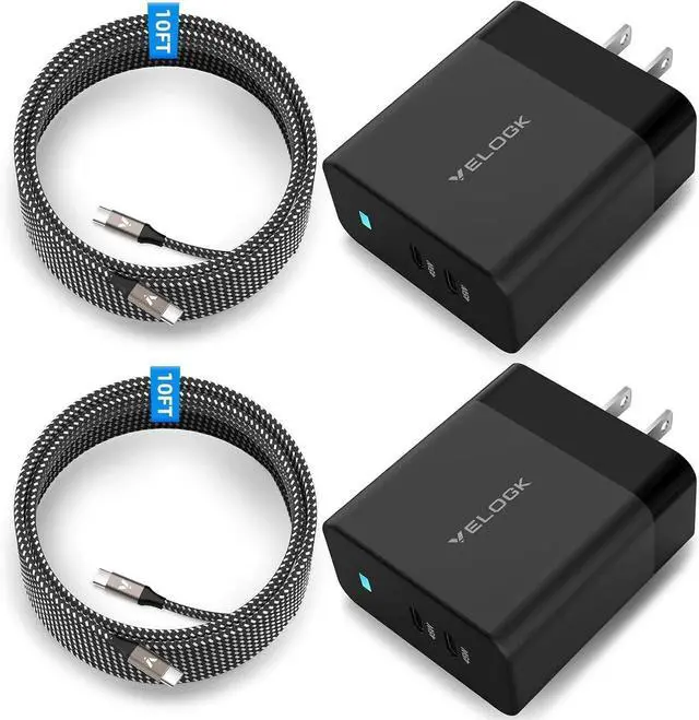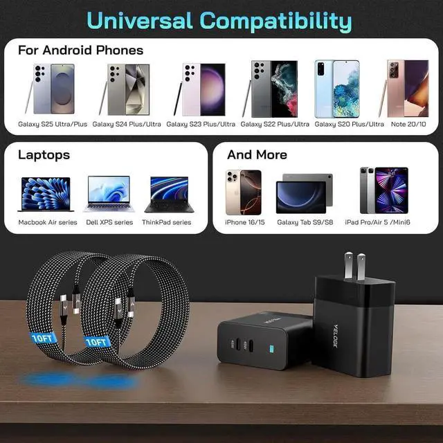 Charging Cords: For Galaxy S24 S25 ultra charger kit come with 2x durable 100W USB C to USB C cables charge at max 5A speed 10 feet extra length allows you to freely charge your phones/tablets from any occasions like on sofa/bed or at office. Data transfer speed up to 480 Mbps. Premium nylon braided material is much more durable for heavy use. Universally Compatible Type C Charger Fast Charging The 45W USB C Fast Charger fits perfectly for almost any USB-C devices and particularly provides super fast charging for [Super Fast