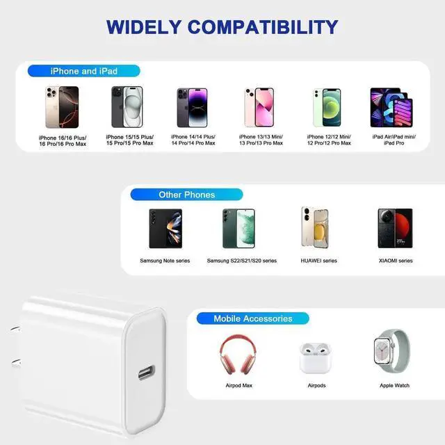 USB C wall chargers: Order has 3Pack USB C charging cradles you can one for the office one at home one for carrying or sharing with friends multiple options. Small and lightweight design is easy to travel with easy to put in your pocket or bag without taking up too much space and ensure you can take it with you everywhere. Convenient for home office and vacation.? USB C Wall Fast Charger not only for iPhone: 20W USB C Charger Block compatible with iPhone 16/iPhone 16 Plus/iPhone 16 Pro/iPhone 16 Pro Max iPhone 15/iPhone 15 Plus/iPhone 15 Pro/iPhone 15 Pro Max iPhone 14/14 Plus/14 Pro/14 Pro Max iPhone 13 series iPhone 12 series iPhone SE (2nd generation) iPhone 11 series iPhone X series iPhone 8 and later; iPad Pro iPad Air iPad Mini 2 iWatch; Galaxy Galaxy Note series; Google Pixel series; series and more.?