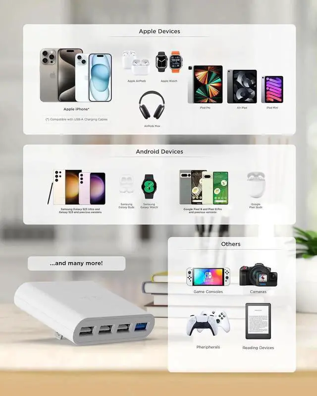 USB PORTS: The AC Pro is one of the most unique cell phone wall chargers on the market- our rapid fast charging block allows you to charge your iPhone Android iPad AirPods and more all at once with any of the 4 USB charging ports.
