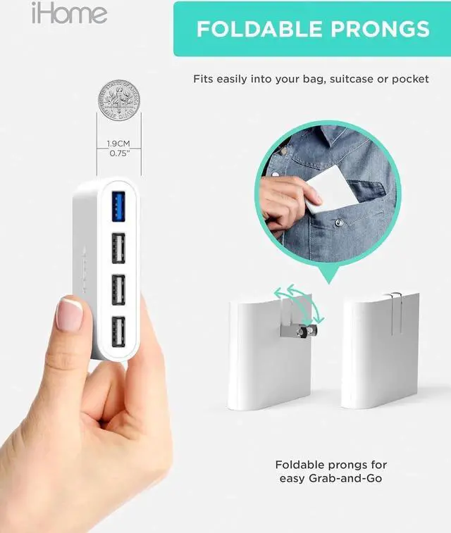 PRONGS: You won't find another iPhone block wall charger that fits as easily into your bag or suitcase as the iHome AC Pro 4 USB wall charger. WALL CHARGER WITH