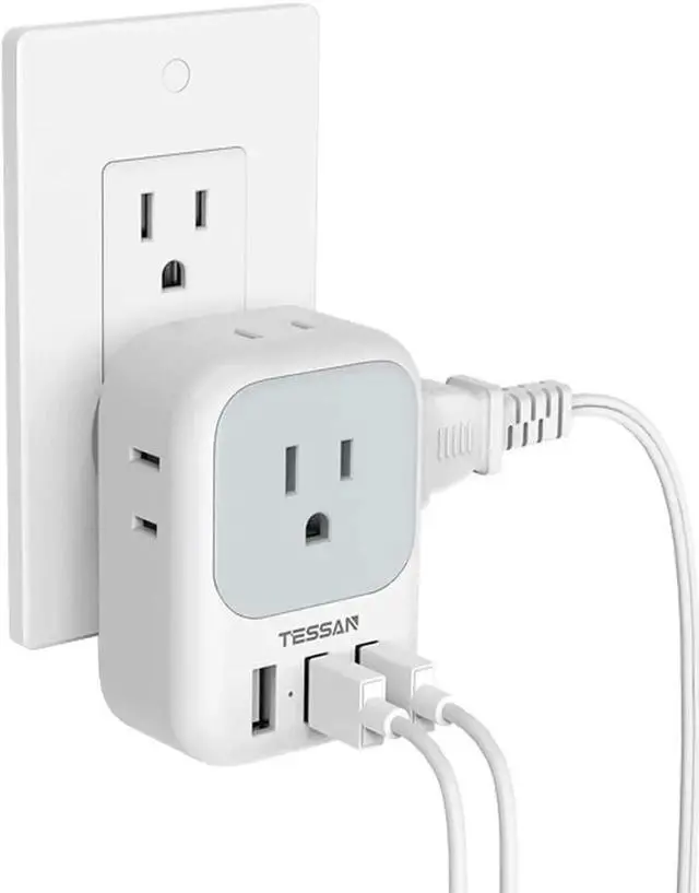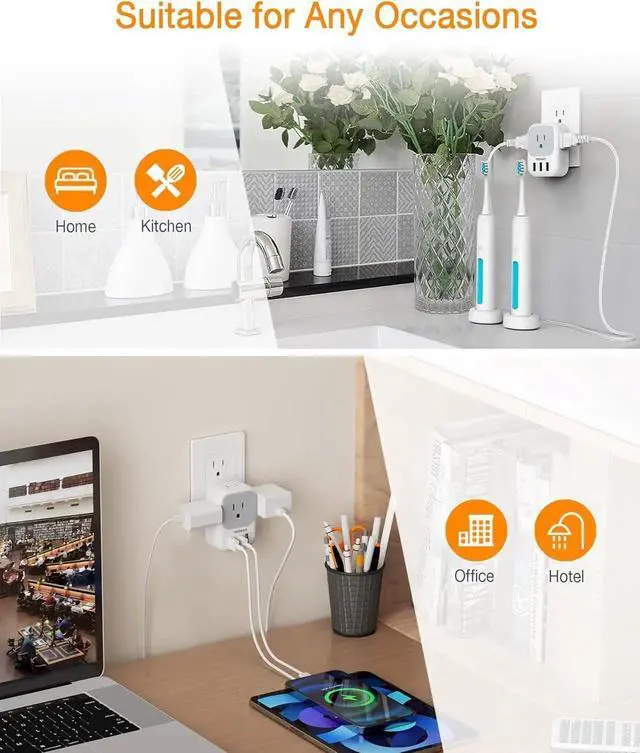 Outlet Splitter: This multiplug electrical outlet extender box could turn 1 socket into 4 AC outlets and 3 USB ports accept the standard N American 2 or 3 prong flat pin plug can charge 7 devices simultaneously; You can use it in any indoor place such as home office and dorm roomWidely