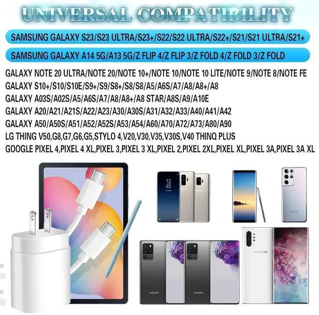 Such as: Galaxy S25 S25+ S25 Ultra S24 S24+ S24 Ultra S23 S23+ S23 Ultra S22 S22+ S22 Ultra S21 S21+ S21 Ultra S21 Plus 5G A15 5G A14 5G A13 5G A23 A53 5G A03s Z Fold 6 Z Fold 5 Z Fold 4 Z Fold 3 Z Flip 6 Z Flip 5 Z Flip 4 Z Flip 3 Note 20 Note 20 Ultra Note 20 Ultra 5G S20 S20 Plus S20 Ultra Note10 Note10+ S10 S9 S8 Active A54 5G A70 A80 Google Pixel 3A 2 3 XL 2XL 3XL 4XL. [ Super Fast Charger Advanced Safety Features] Approved for USB-IF UL-ETL-FCC-CE Certification and Strict Quality Control. Built in High-Tech Smart Chip and 56 Pull-Up Resistor Adjust Voltage & Current output to Match Connected Phone Devices and Design With Over-Voltage Over-Current Over-Heating Short-Circuit Protection. The USB C Cable Built-in E-Mark Chipset can Automatically identify the Charge Current Required for your Phone Charge your Device Fast Safely and Steadily. [Intelligent Chip Technology] 25W Super Fast Charger USB C Power Delivery 3.0 Fast Charger Adopt to the Latest Smart iC Chip Tech can Auto-Detect Device Connected in USB C Port While Also identifying the Appropriate Current to Charge Each of your Device optimally at Their Fully intended Speeds up to a Total of 3.0A and Guarantee your Devices are Charging at Their Maximum Speed the Sophisticated Protection Measures to Ensure Safety for you and your Device.