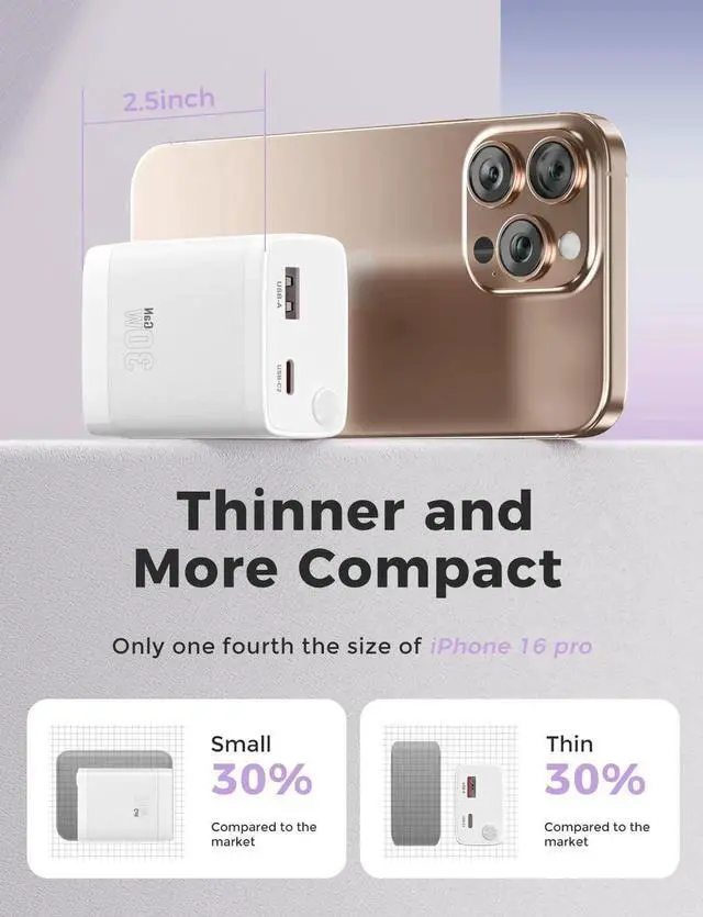 (Note: The built-in USB-C cable is only suitable for Phone 15 & 16 other Phone models need to use your own cable to plug into another USB-C port. ) When connected to a single USB-C device it delivers a maximum output of 30W enabling you to charge your Phone 16 Pro to 65% in just 30 minutes significantly saving you time! Built with