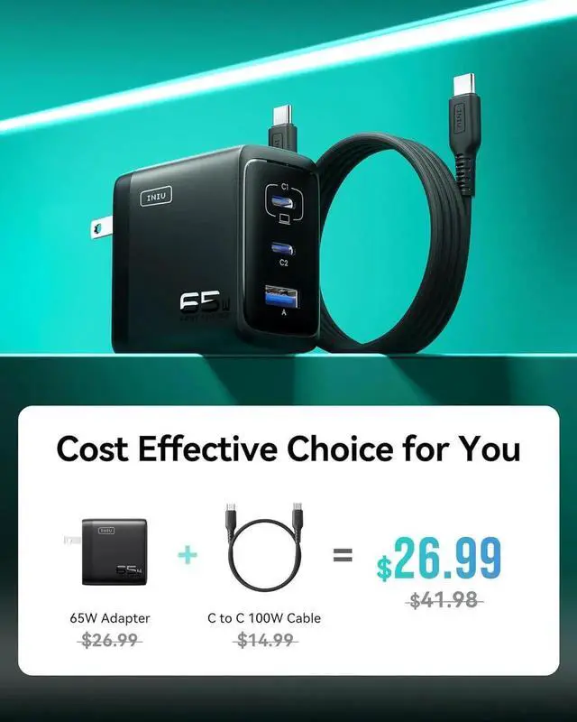 What You Get: INIU 65W Wall Charger x1 Fast Charging USB-C Cable x1 User Manual x1 Industry-Leading 3-Year INIU Care and Lifetime Technical Support.