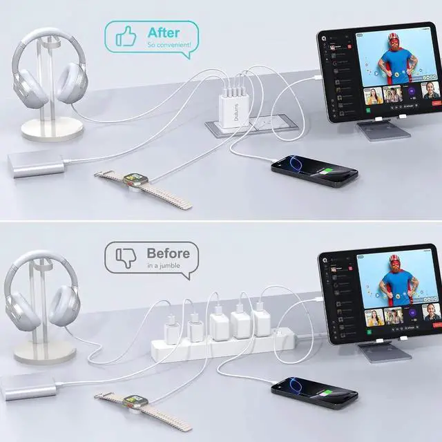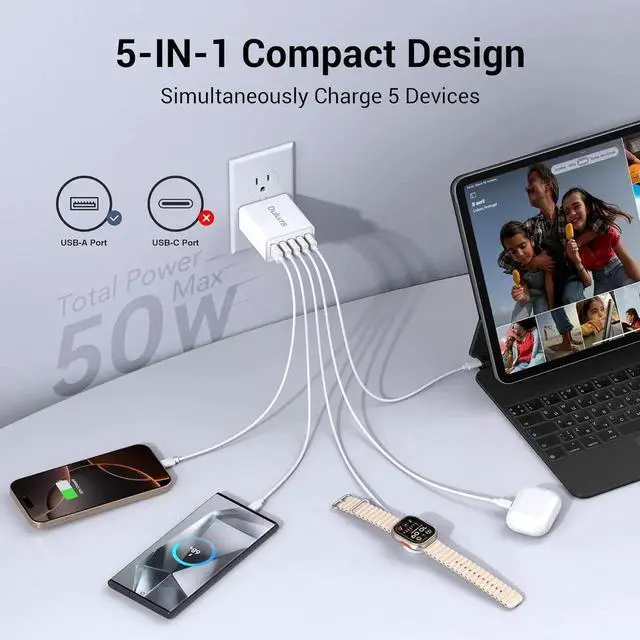 Charging Block: Multiport wall charger has 5 USB-A ports. It can charge multiple devices at the same time including cell phones tablets mobile power and headphones and game consoles etc. and it minimizes waiting time. It minimizes waiting time and saves you a lot of space making your desktop more tidy50W Fast