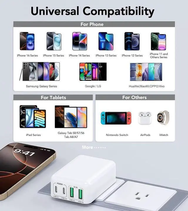 All Devices: Thanks to the special 4 ports the USB Charger Cube Plug is compatible with almost all electronic devices such as iPhone 16/16 pro/16 plus/16 pro max/15 Pro Max/15Pro/15 Plus/15//14/14 Pro/14 Pro Max/14 Plus/13/13 Pro Max/13 Pro Max/13 Mini/12/12 Pro/12 Pro Max/12 Mini/11/11 Pro/11 Pro Max iPhoneXS/XS Max/XR/X/10/8/8 Plus/7/7 Plus/6/6S/SE 2020 iPad iPad Pro iPad Air iPad Mini Galaxy S24/S23/S22/S21/ S20/S10/S9/S8/S7/S6/A12/A13/A22/A32/A52/A53/A71/Note 20 10 LG Motorola Pixel Kindle tablet Pixel AirPods4 Watch10 etcSafe and reliable wall-mounted charger: The charging cube has a built-in smart chip to bring better power and performance such as preventing extreme working conditions (such as overcharging/overcurrent/overheating) automatically recognizing different devices for effective charging and automatically stopping charging when fully charged